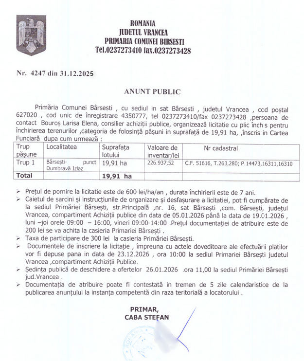 Posted in Administrație Anunț. Primăria Bârsești (județul Vrancea) organizează licitație pentru închirierea terenurilor (categoria de folosință pășuni) editienationala.ro 31 decembrie 2025 Leave a Comment on Anunț. Primăria Bârsești (județul Vrancea) organizează licitație pentru închirierea terenurilor (categoria de folosință pășuni) Author: editienationala.ro